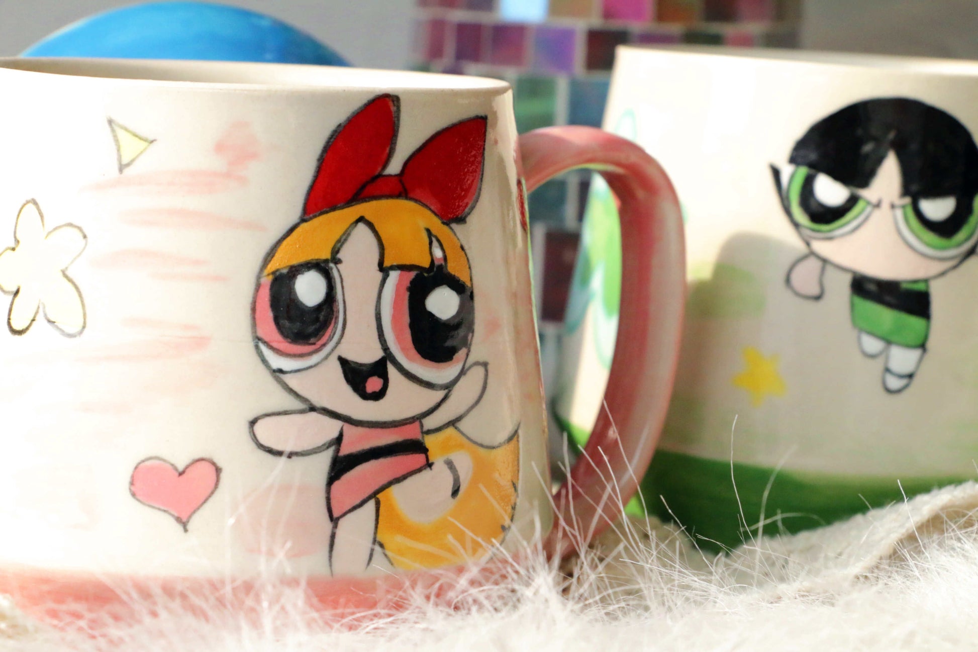 Powerpuff Girls Ceramic Mugs, Kawaii Handpainted Personalized Ceramic Cup for Anime Lovers